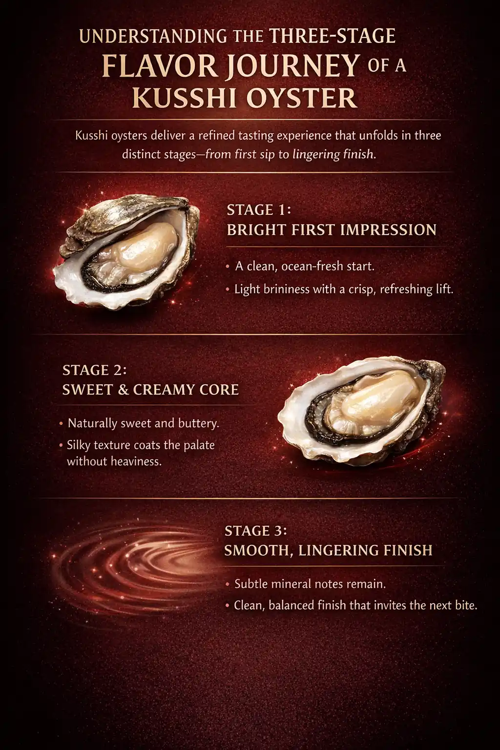 This flavor progression isn’t accidental. Kusshi oysters are selectively bred and slow-grown in cold Pacific waters, a process that allows sugars, glycogen, and texture to develop evenly over time. In this article, we break down each stage of the Kusshi oyster’s flavor journey—explaining what you’ll taste, why it happens, and how to recognize it—so you can understand not just that Kusshis taste is refined, but why they do.